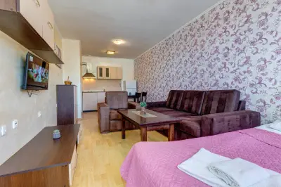 • Едноспалните апартаменти - състоят се от стая със спалня или 2 събрани легла, дневна с кухненски бокс с посуда, хладилник, термо-кана, 2 котлона, баня с тоалетна и душ кабина, тераса, диван, който се разпъва и телевизия. В някои има и допълнително трето редовно легло