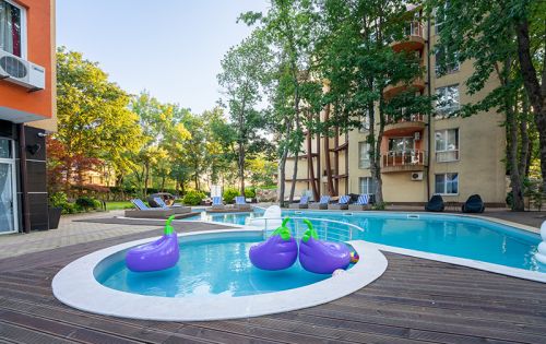 - Плувен басейн – Шезлонги и чадъри – безплатно за гости на хотела при наличност