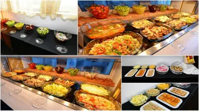 Закуска, (с включени топли напитки,кафе,чай,мляко и минерална вода,сок) обяд и вечеря на блок маса - на сет меню по избор ( до 30 човека) или на блок маса (над 30 човека)