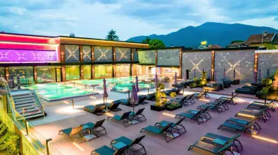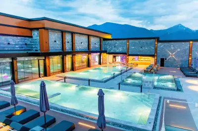 Удивителен външен басейн с плаж и вътрешни басейни с термална вода.
