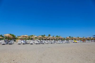 Плаж: Собствен пясъчно-чакълест плаж с дължина от 340 м. Шезлонги, чадъри, матраци, плажни кърпи - безплатно. Вход в морето - пясък, камъчета. Бар на плажа - безплатно.