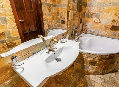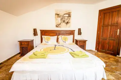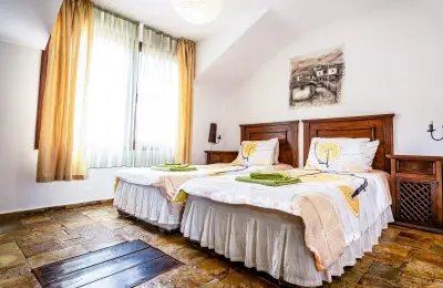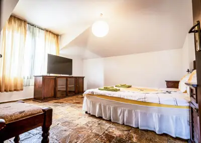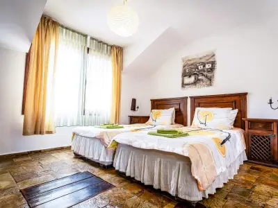 Хотелът разполага с 8 стаи и 7 фамилни апартамента. Във всички има автентични рисунки на стената, a обзавеждането е в традиционен за района на Огняново стил. Стаите са изцяло изпълнени от естествени материали – подът в стаите е от каменни плочи, баните с течаща минерална вода също са изцяло в камък. Всички стаи и апартаменти са изпълнени в старинен, традиционен за района на Гоце Делчев стил. Стаите са със самостоятелни бани с вани и кабелна телевизия. Семействата с деца са добре дошли в просторните апартаменти по 70 м2, с камини и вани с джакузи, кабелна телевизия, интернет, големи тераси.