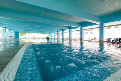 Вътрешен басейн с полу-олимпийски размери с минерална вода, детски басейн с топла минерална вода, сауна, парна баня, арома парна баня и джакузи с минерална вода