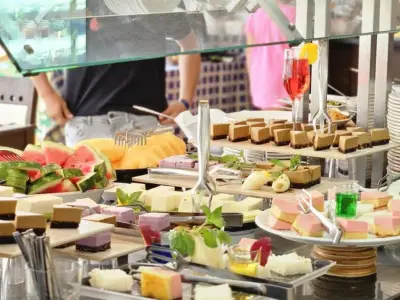 Ресторантът има богат избор на салати, предястия, месни и вегетариански ястия, пици, спагети, десерти, сладолед, плодове както и голямо рарнообразие на алкохолни и безалкохолни напитки и отделно от това предлага снак бар в следобедните часове където можете да се насладите на пица, дребни сладки, соленки, кекс, сладолед и други + кафе, капучино, мляко с нес, мляко с какао, горещ шоколад, чай, безалкохолни напитки, сок, минерална вода и други.