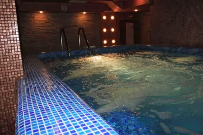 Външен сезонен басейн с детска зона, релакс зона вътрешен релакс басейн тип джакузи, с вградени хидромасажори, сауна и парна баня