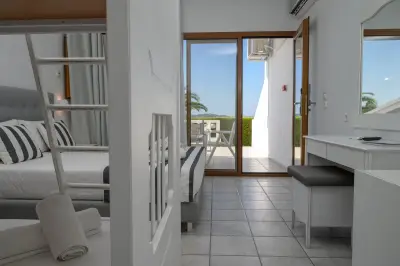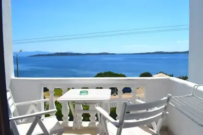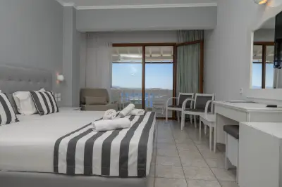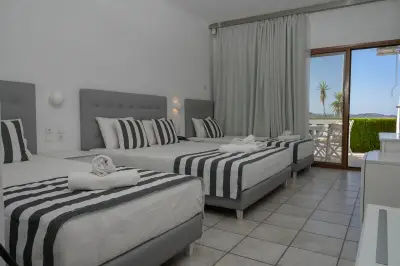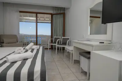 All rooms at Akti Ouranoupoli have a balcony with view to the sea, the pool, or the garden. A TV with satellite channels, music and a fridge are included.