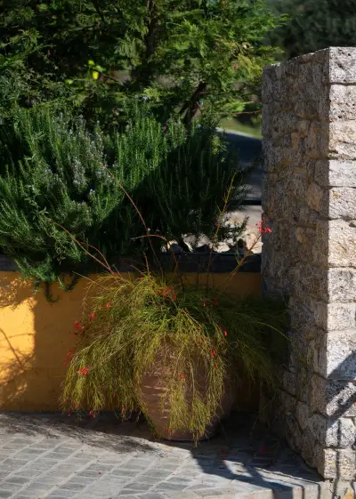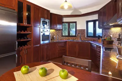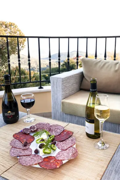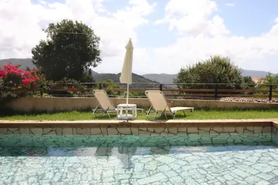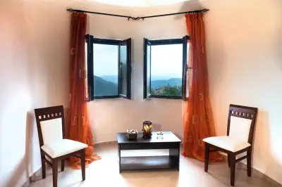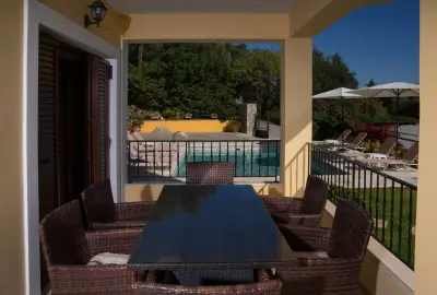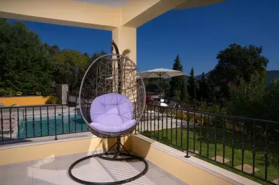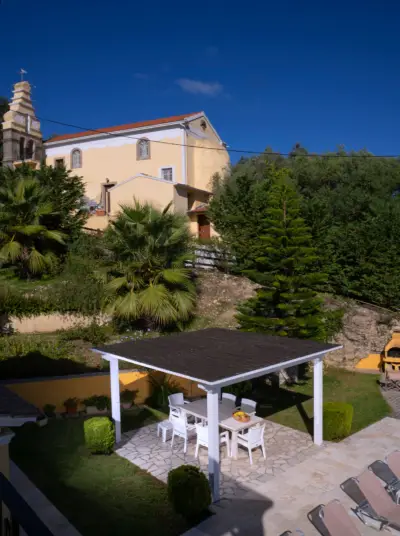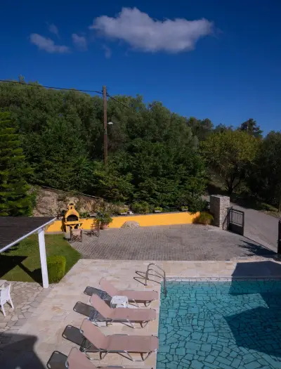 Large veranda with sitting and outdoor dining furniture. A gazebo for relaxing afternoon cocktails or tea. Built-in BBQ facilities available for a real countryside outdoor dining experience. A dip pool (small swimming pool) and sun loungers also available in order to enjoy the endless interaction of light and nature. Well maintained gardens that offer beautiful surroundings & privacy and parking space for 2 car seats. Your private (pick-your-own), small organic farm, for a real taste of Corfiot local products.