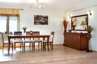 Large, brand new, open plan fully equipped kitchen with a large dining table and enough space to sit 10 guests. Oven, large fridge/freezer, dish washer, stove, electric kettle, toaster, kitchenware & kitchen utensils, pans, kettle and anything one may need in order to prepare meals and enjoy the flavors of the local products!