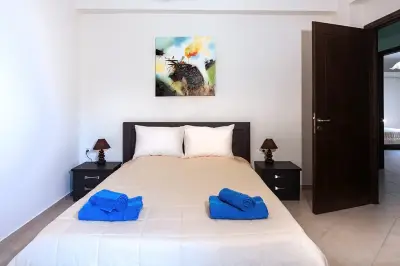 A twin bedroom downstairs (which is also used as the gym) with a small bathroom right outside. All main bedrooms are located in the upper floor. The marbles staircase leads to the upper floor where there are 3 bedrooms. The Master bedroom has a queen size matrimonial bed and en suite bathroom both with shower cabin and a Jacuzzi bathtub and 2 water basins. Another 2 bedrooms (matrimonial beds) downstairs are locate in the same floor, which share another bathroom (with bath tub). Both the master bedroom and one double open to a large, furnished shaded-pergola veranda with stunning views to the open countryside and vast olive groves. Minimal modern furniture and utilities, together with ample space and bright sunlight offer a relaxing decoration and make you want to stay in bed! One of the bedrooms has 2 windows that offer 180 stitch view from inside.