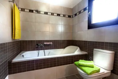 1 bathroom downstairs, with a washing machine which is essential if one stays long, and another 2 bathrooms in the upper floor. One of them is with bath tub share between 2 double bedrooms. The other one is in the Master bedroom (en suite) and features 2 water basins, a shower cabin and a Jacuzzi bath tub.