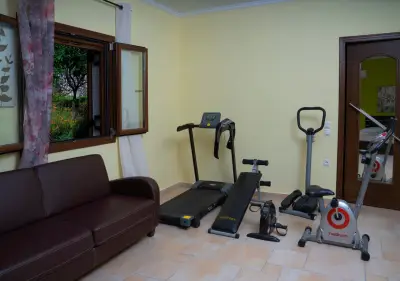 The main entrance in the ground floor opens to a large living room/dining area with a blend of modern and traditional furniture that create a relaxing environment. Large doors open onto the ground floor veranda with access to the garden and outdoor dining facilities for you to enjoy breakfast and light meals. Living rooms is air conditioned. There is also a small bathroom in the ground floor and a large room which is used as the gym when parties of residents consist of up to 6 guests. It can be used as an extra bedroom though; as it can accommodate 2 guests in single beds (most guests use it as child bedroom).