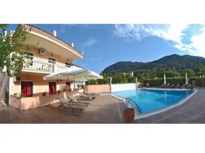 Corfu Sun Pool Side is located in Benitses. It is surrounded by green mountains and is only 164 feet from the sea, this hotel offers a swimming pool with free sun beds & umbrellas, hot tub and a separate childrenâs pool. The modern and bright Corfu Sun Apartments have furnished balcony with beautiful views of the surrounding countryside, the sea or the pool. Each has a fully equipped kitchen with oven, microwave oven, coffee maker, kettle, fridge and dining table. The Corfu Sun Apartments is located only 7.5 mi driving from Corfu Town, 6.2 mi from the airport and 1.2 mi from Achillesâ Palace. Benitses center, with its taverns and shops, is only 262 feet away. The staff is on hand throughout the day and provide guests with car rental service and tourist information. Guests can use the hotelâs free private parking area.WiFi is available in the hotel rooms and is free of charge.