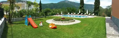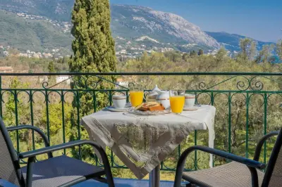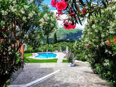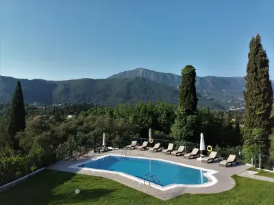 balconies overlooking the lush green landscapes of Corfu, the swimming pool and