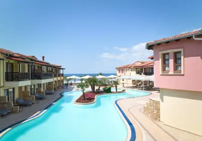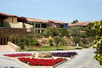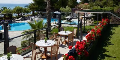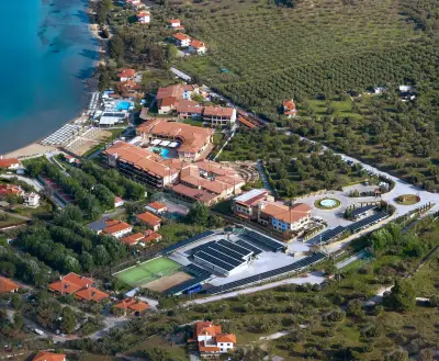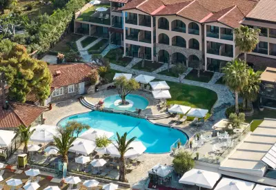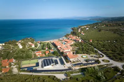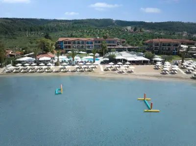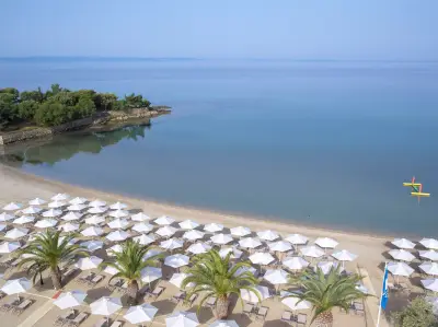 "Anthemus Sea Beach Hotel & Spa" located on a site of 38.000m lies embosomed in a picturesque bay along the tranquil "Elia Coast" of Sithonia in Halkidiki, right next to a sandy beach awarded with the "Blue Flag" of the European Community. Our shuttle bus takes you daily (except Sundays) to the nearby villages of Neos Marmaras or Nikiti.