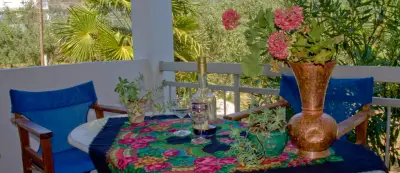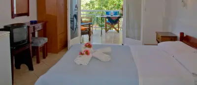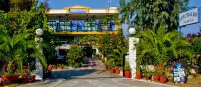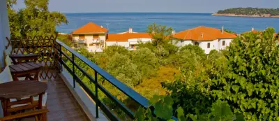 Blue Bay Hotel is situated in Kinira, Thassos, only 40 metres away from the beach. The Hotel consists of 17 rooms and studios with TV, refrigerator, air conditioning, a furnished balcony or yard. Its restaurant serves quick meals and drinks in a lovely courtyard. The rooms of Blue Bay are equipped with a TV and a fridge. They all have a private bathroom with shower. Some rooms also enjoy views to the Aegean Sea from their balcony. A basketball court and a childrenâs playground are available at the garden. Free parking is available and there is an ATM and a mini market within 150 m.