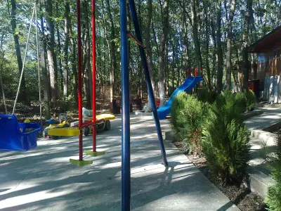 Детска площадка с люлки, пързалка, пясъчник.