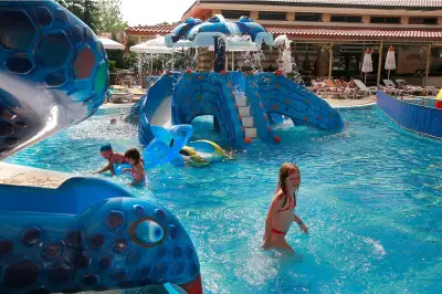 Децата ви несъмнено ще се зарадват в двата детски басейна с мини аквапарк, а вие – от спокойствието и красотата на нашата градина около басейните.