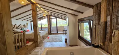 - Мансардно спално помещение с дизайнерска спалня и нощни шкафчета от дърво; Хидромасажна вана в същия стил с панорамна гледка; Единичен разтегателен диван и холна маса; Гардероб, скрин; Климатик; Тераса; Тоалетна с мивка.