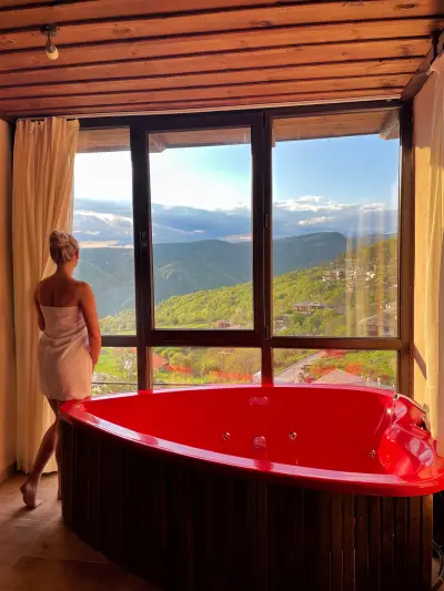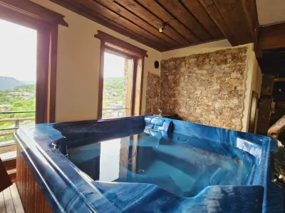 Стая Делукс, освен стандартното обзавеждане, предлага спалня тип балдахини, камина, заредена с дърва и хидромасажна вана във формата на сърце пред панорамен прозорец с гледка към с. Лещен.