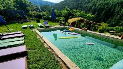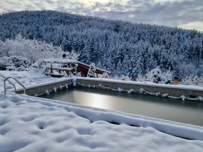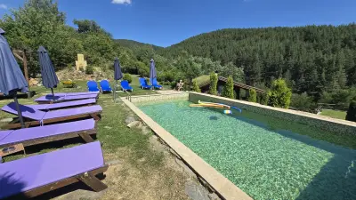 Водата е от собствен водоизточник и се отоплява на соларни панели, ел. бойлер и термопомпа.