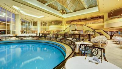 Гледащ към основния басейн, тук е мястото където ще можете да се насладите на закуската, обяда и вечерята си.