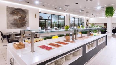 Разполага с бюфет за закуска, основен ресторант и бар.