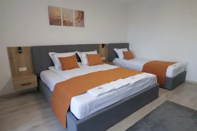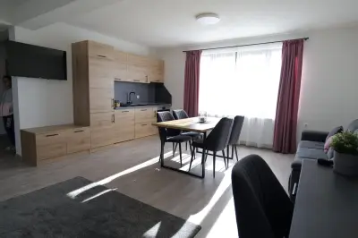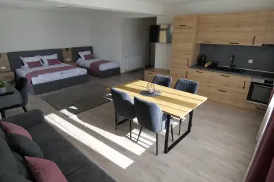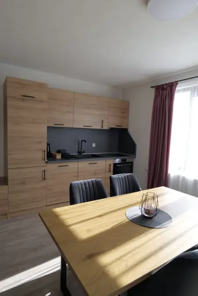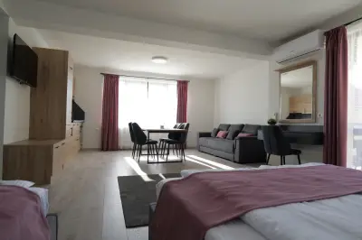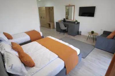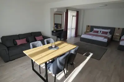 • Фамилно студио - спалня и едно единично редовно легло, разтегателен диван (за 2-ма), маса за хранене, кухненски бокс, оборудван с печка, котлони, миялна машина, хладилник, електрическа кана за вода, прибори за хранене, тераса, гардероб, баня с душ кабина, сешоар, хавлиени кърпи и халат, чехли и тоалетни принадлежности, LED HD телевизор, wi-fi и климатик.