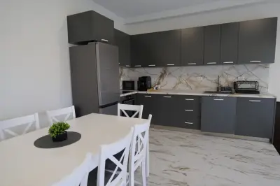 • Частно барбекю - трапезария, барбекю, кухненски бокс оборудван с печка, котлони, микровълнова фурна, миялна машина, хладилник, прибори за хранене, кафе машина с кафе, телевизор с плосък екран и климатик.